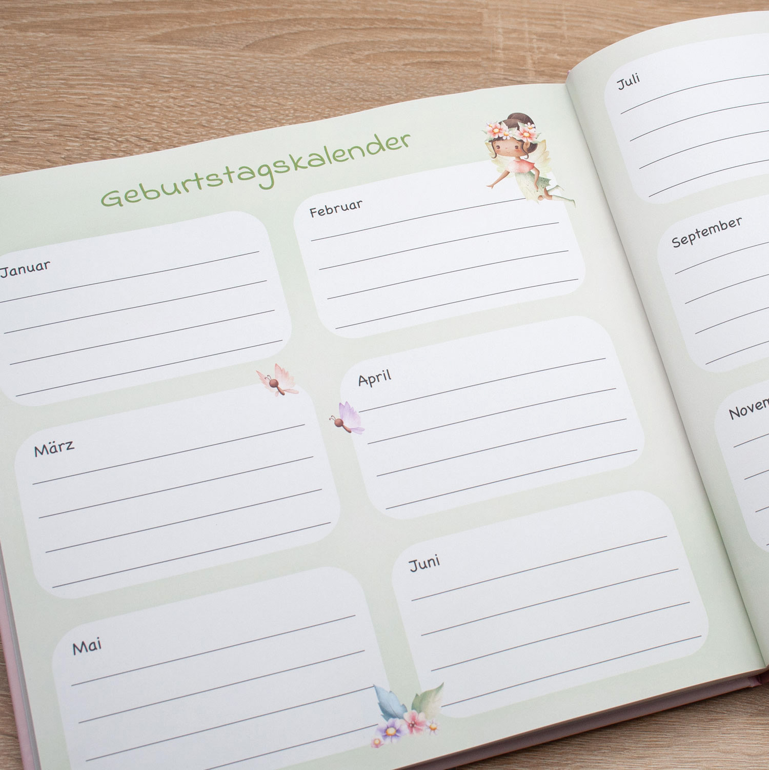 – Besondere Extras: Geburtstagskalender, 2 persönliche Seiten für die Besitzerin sowie 3 Seiten für Gruppen- & Erinnerungsfotos