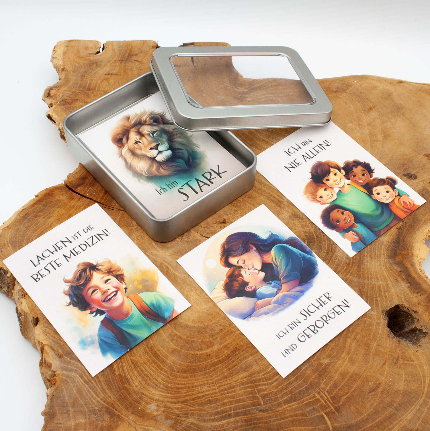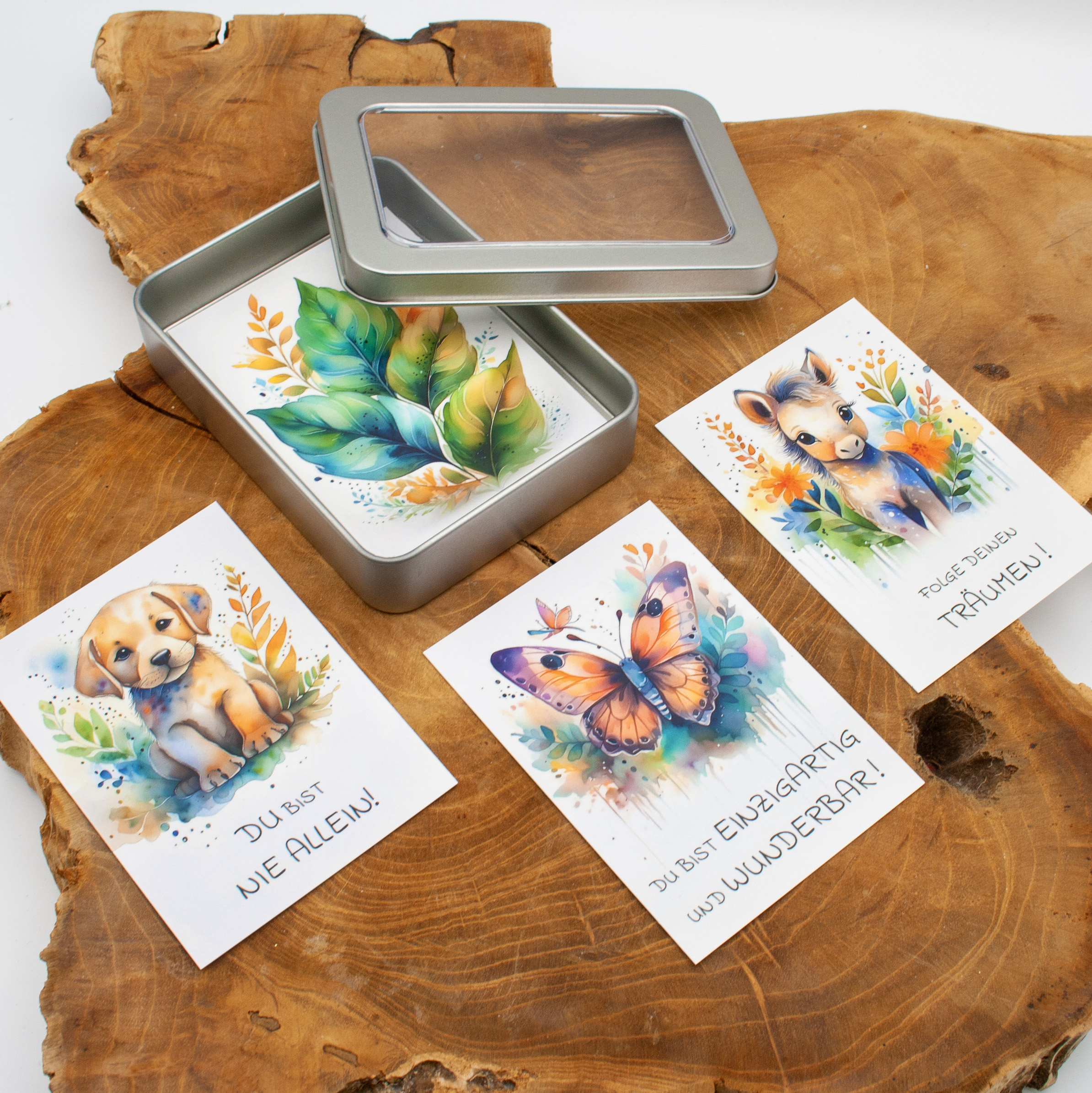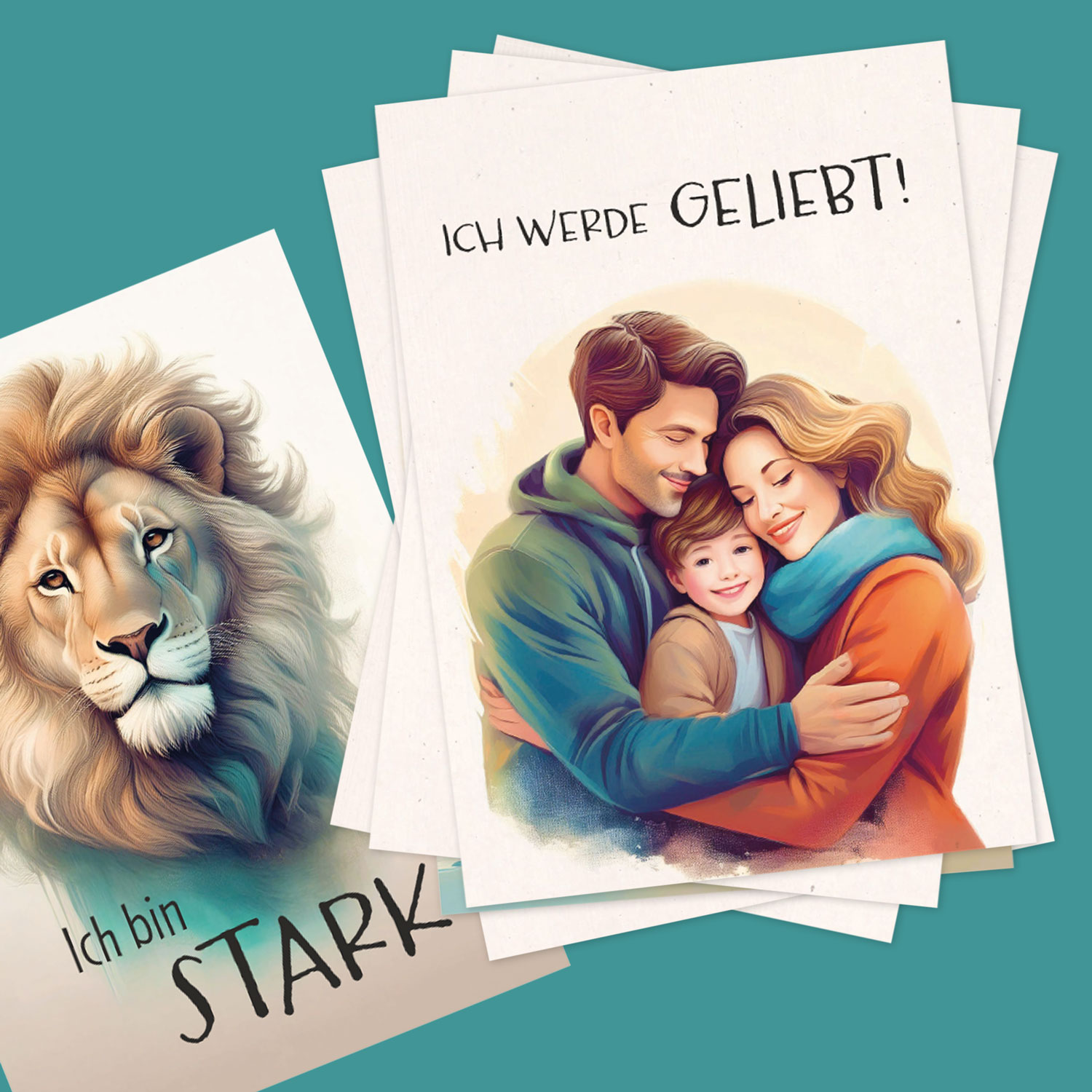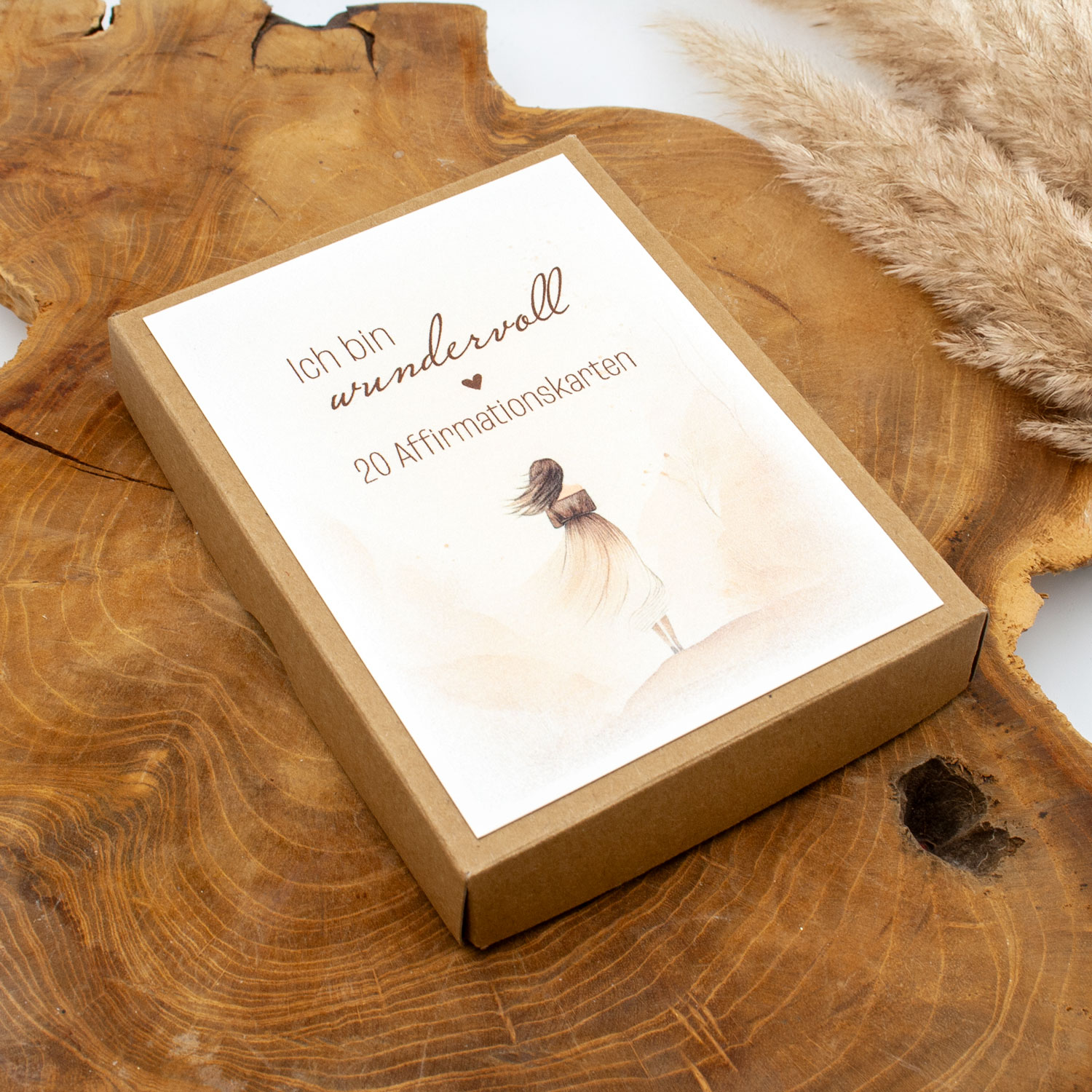 – 20 Affirmationskarten beidseitig bedruckt in einer praktischen Stülpschachtel aus Naturkarton