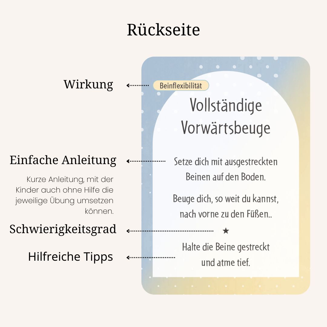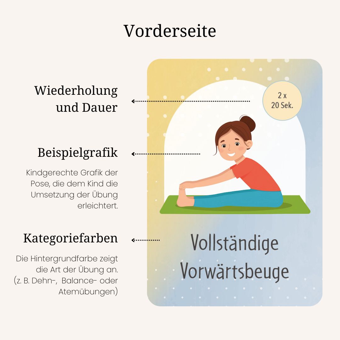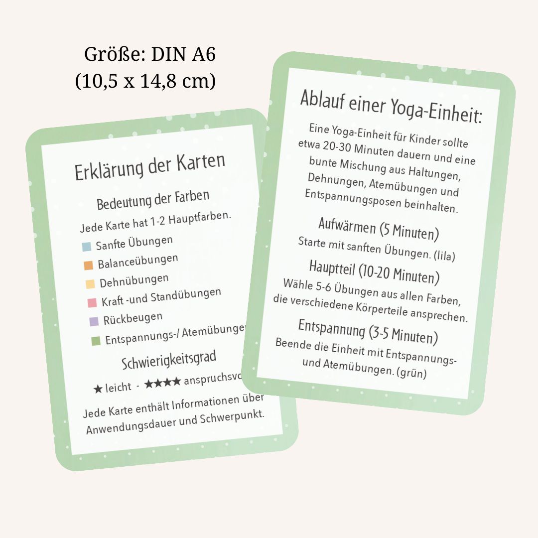 Jede Yogakarte gibt auf der Vorderseite Informationen zu Wiederholung und Dauer, kindgerechte Illustration der Übung und Hintergrundfarben, welche die Art der Yogaübung anzeigt. Auf der Rückseite findet man Angaben zu Wirkung und Schwierigkeitsgrad der jeweiligen Übung und es wird eine einfache Anleitung mit Tipps zur Umsetzung beschrieben.