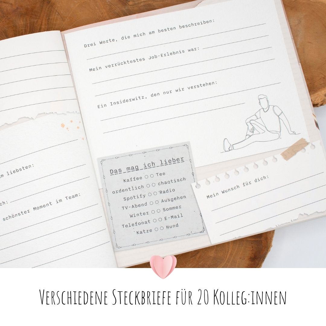 Ob als Abschiedsgeschenk, zum Ruhestand, zum Geburtstag oder zum Jubiläum – dieses Buch bietet 20 Kollegen Platz, um lustige Fragen zu beantworten, persönliche Worte, gute Wünsche und gemeinsame Erlebnisse festzuhalten. Besonders schön: Auf vier Doppelseiten können persönliche Botschaften geschrieben und auf drei Doppelseiten Bilder eingefügt werden. So entsteht eine wunderbare Sammlung an Erinnerungen, die die gemeinsamen Momente in der Arbeit unvergesslich macht.