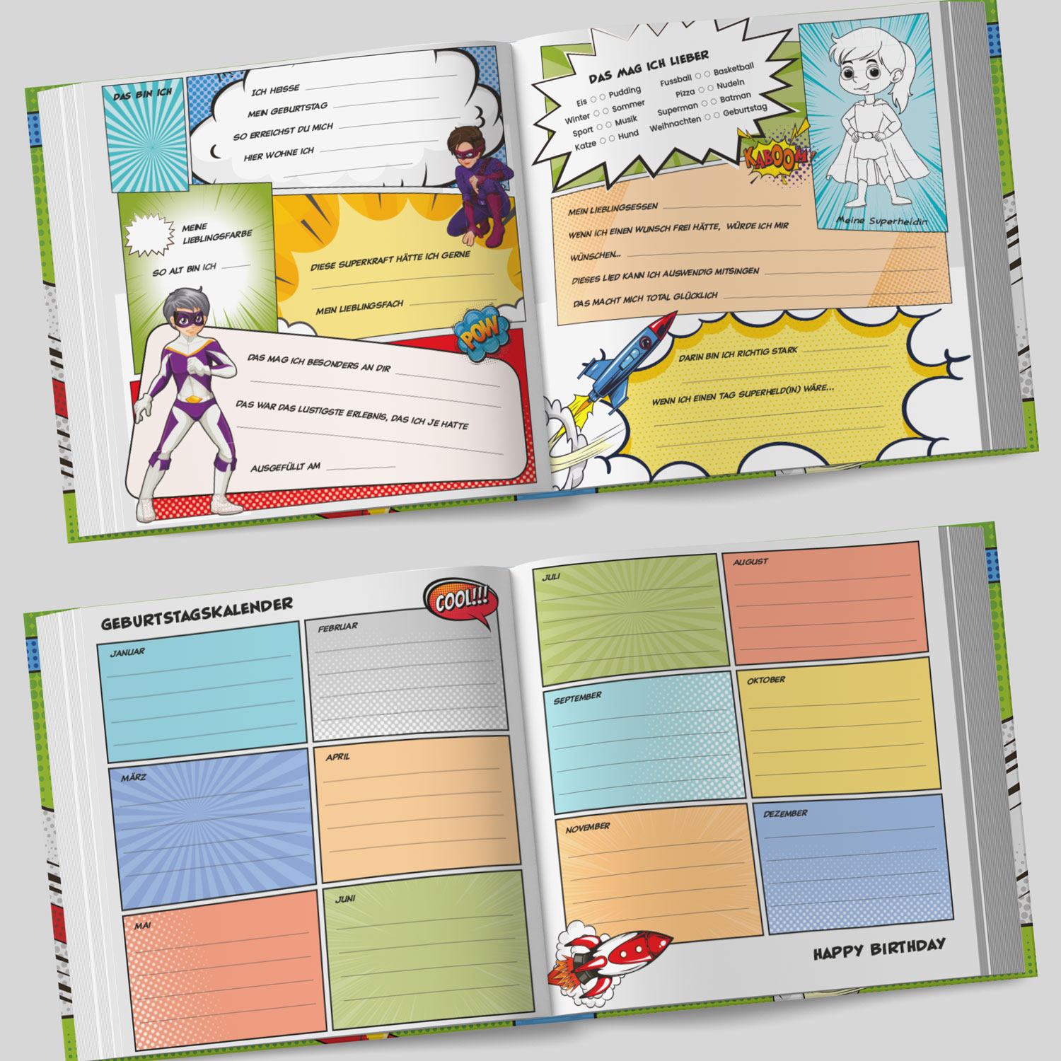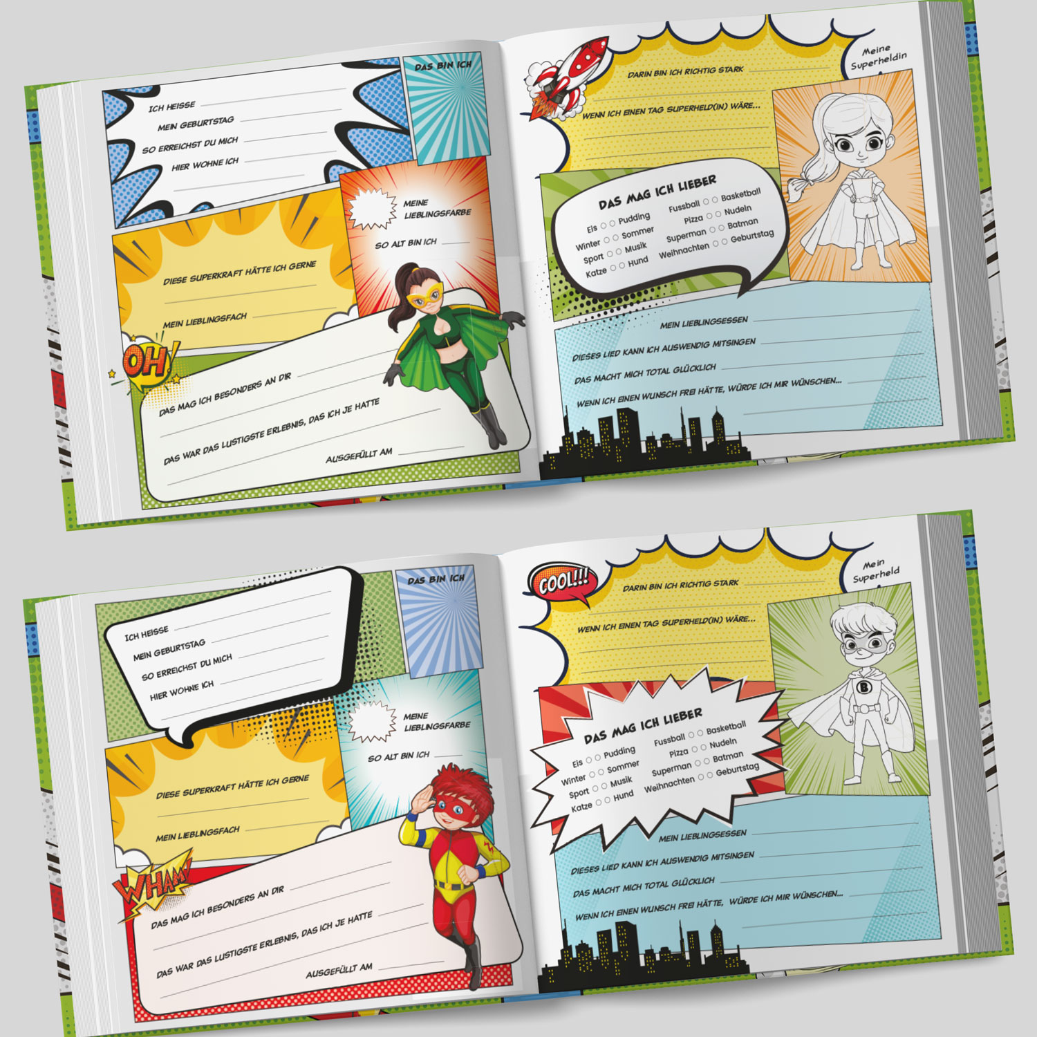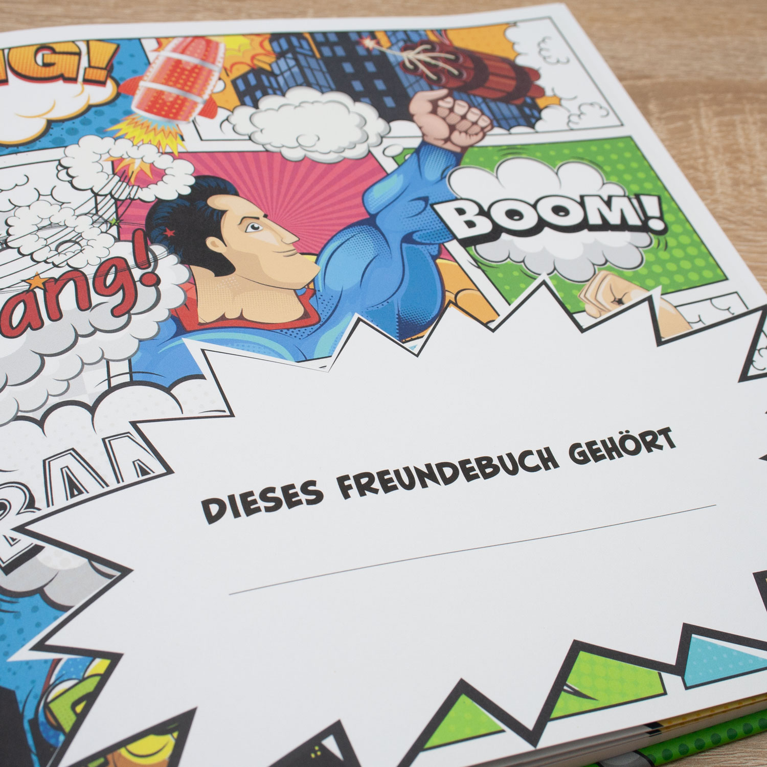 Dieses Freundebuch im Superhelden-Design ist ein fantastisches Erinnerungsalbum und ein perfektes Geschenk zum Geburtstag, zum Schulanfang oder zu Weihnachten – ideal für alle kleinen Comicfans.