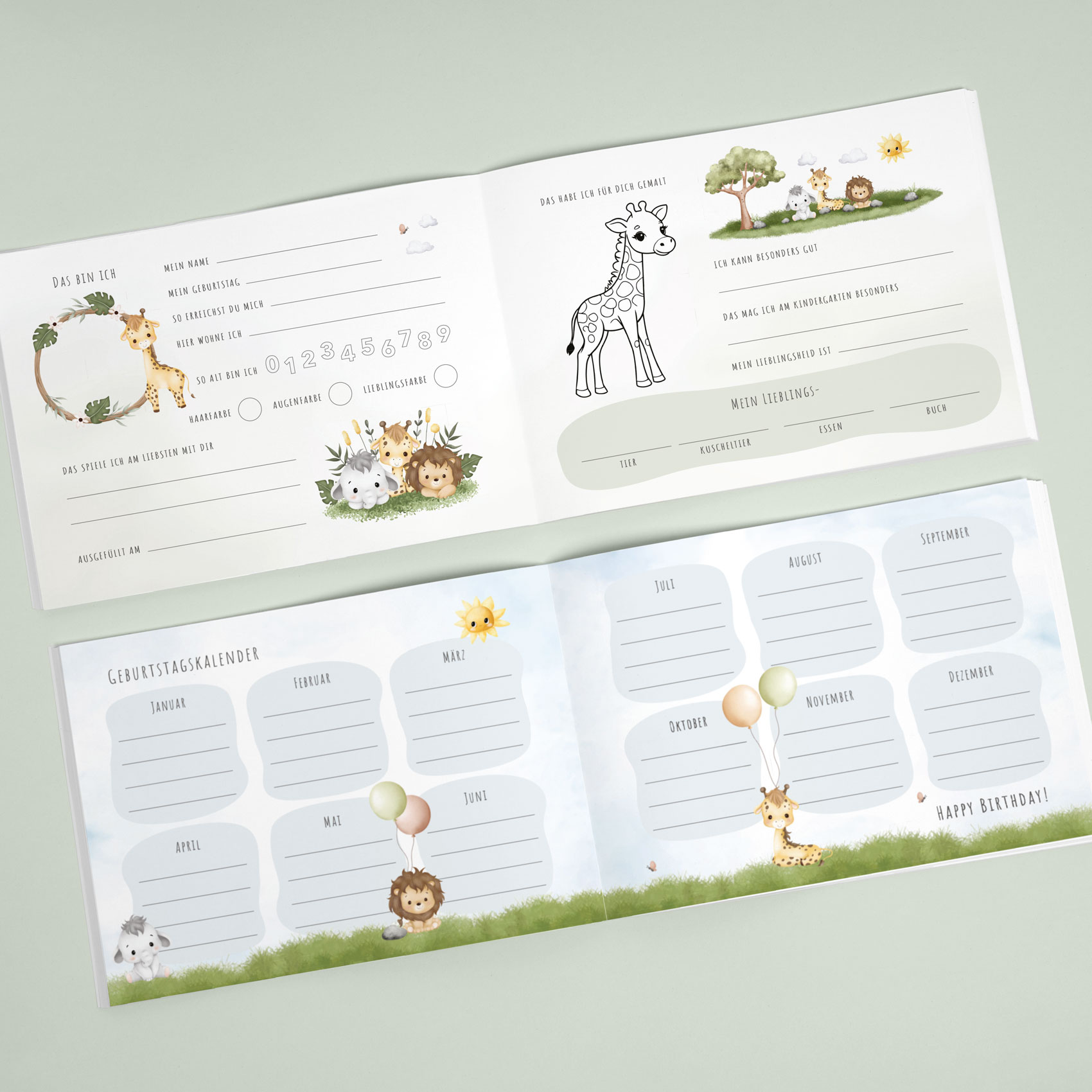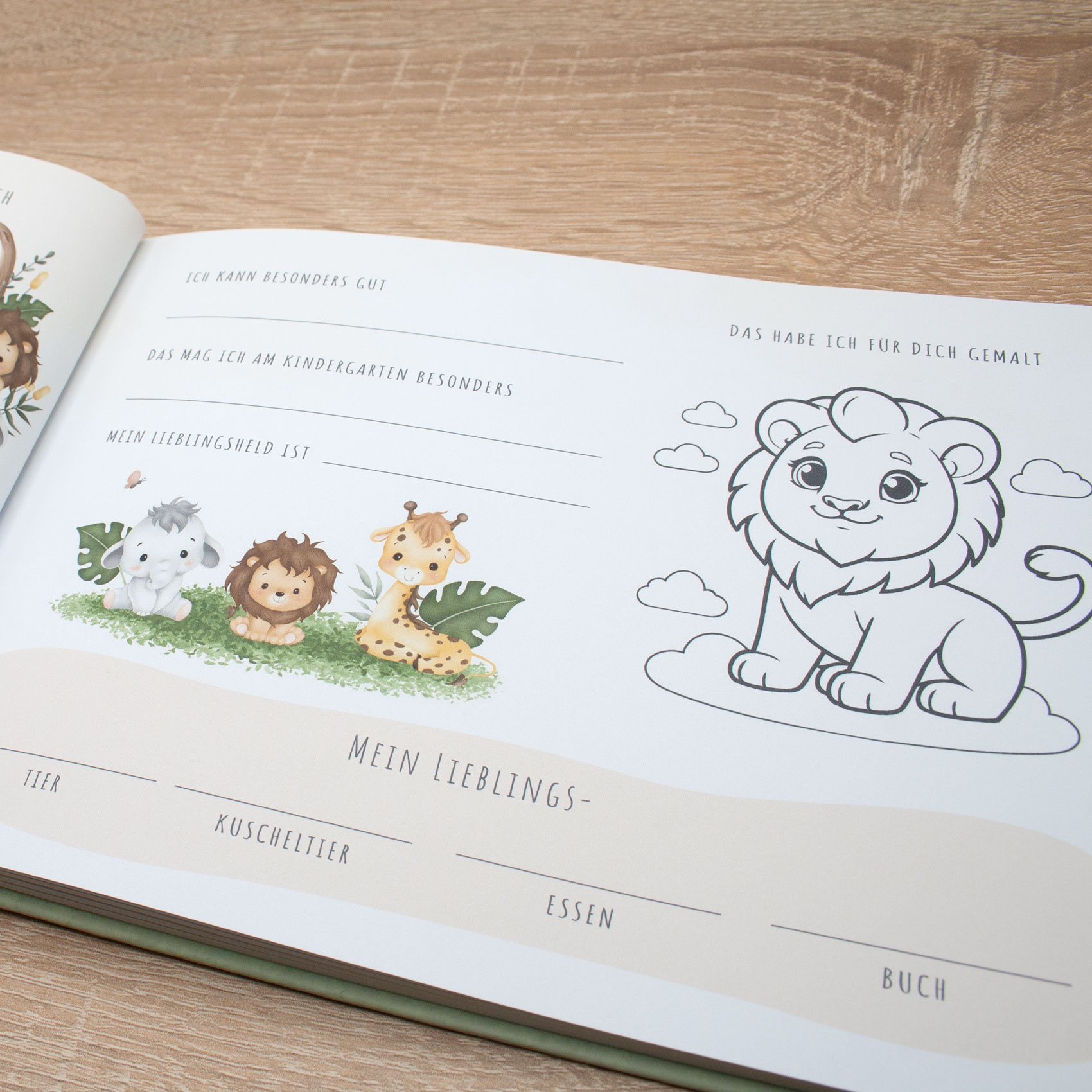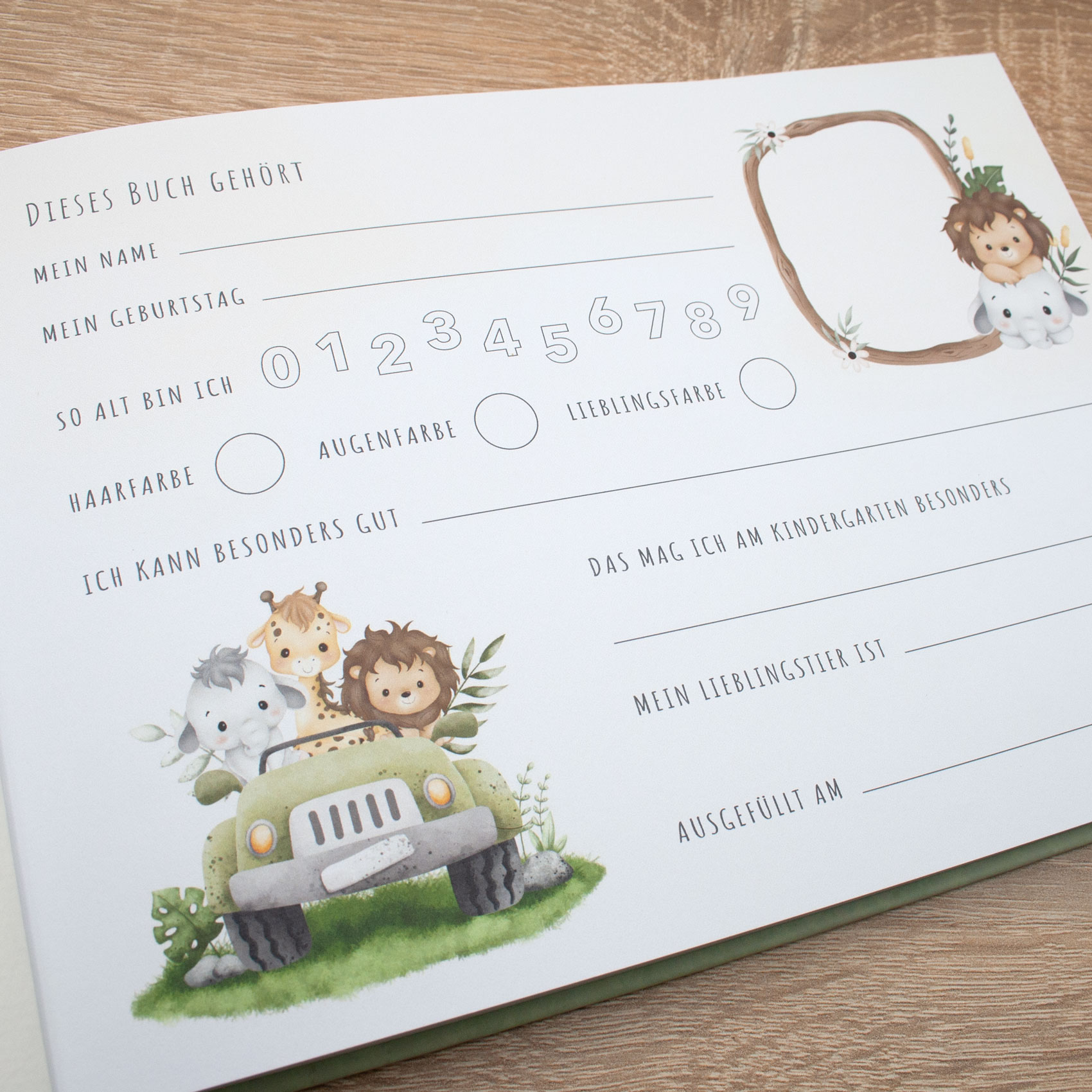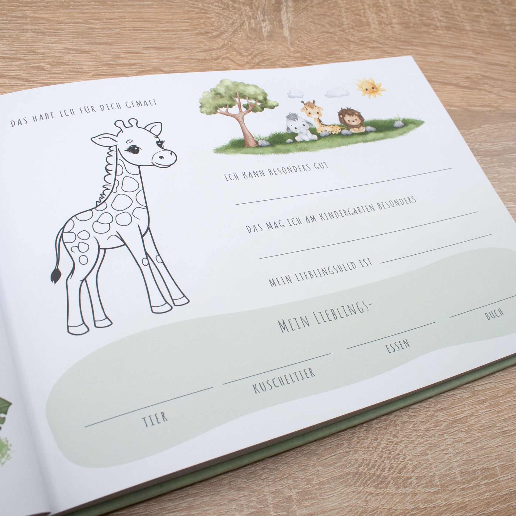 Dieses Kindergarten Freundebuch im Safari-Design ist ein tolles Erinnerungsalbum und ein perfektes Geschenk zum Geburtstag, zum Kindergartenstart oder zu Weihnachten – ideal für alle kleinen Tierfreunde.