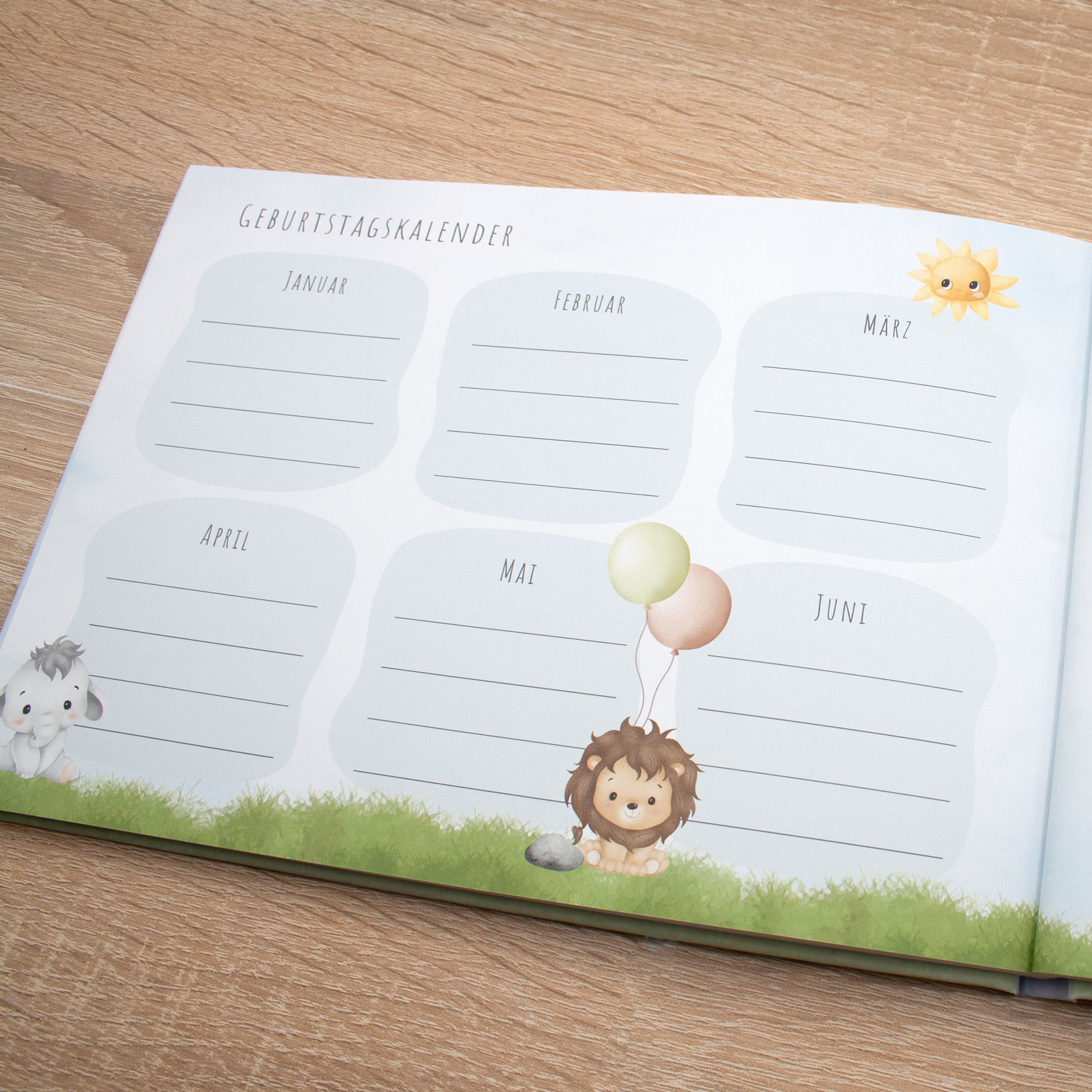 Dieses Freundebuch ist in 3 herzlichen Designs je Doppelseite gestaltet und bietet Platz für insgesamt 30 Freunde. Die erste Seite darf der kleine Safari-Fan, dem das Buch gehört, selbst ausfüllen. Es gibt auch eine spezielle Seite, auf der alle Kindergartenfreunde ihre Geburtstage eintragen können, damit kein besonderer Tag vergessen wird.