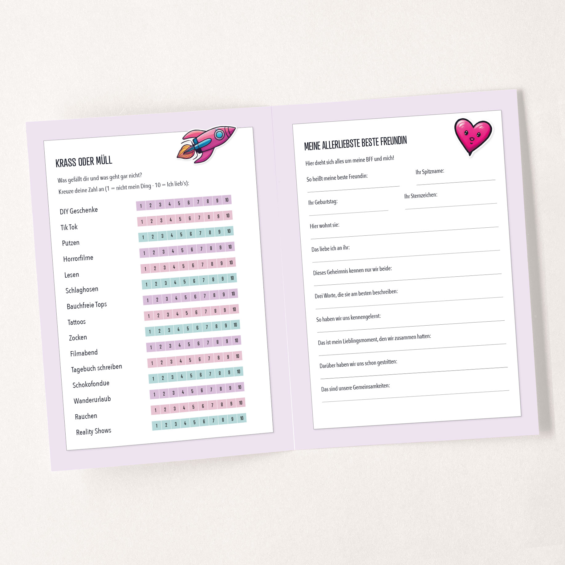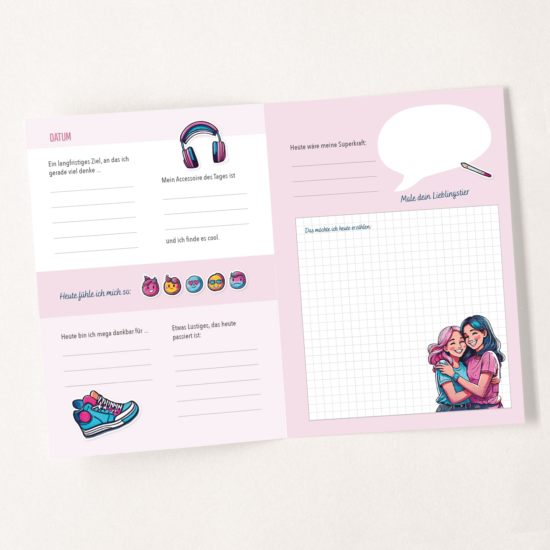 👭 Zum gemeinsamen Ausfüllen: Viele Seiten sind farblich markiert – für dich und deine Freundin. Ihr schreibt beide, ergänzt euch und erschafft gemeinsam ein Erinnerungsstück.