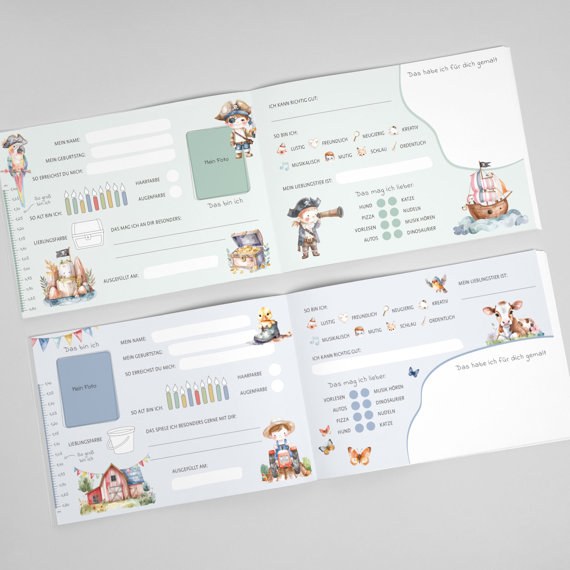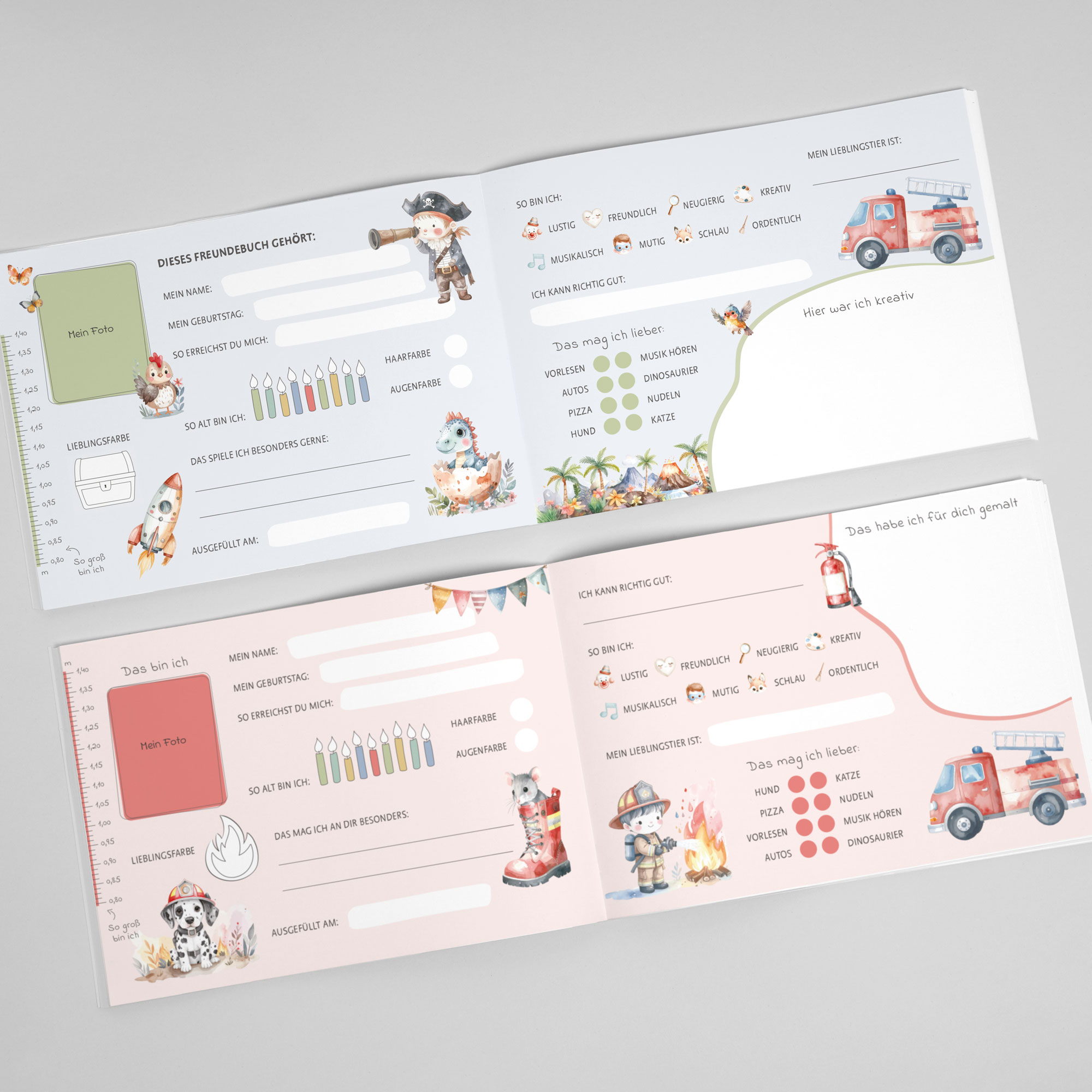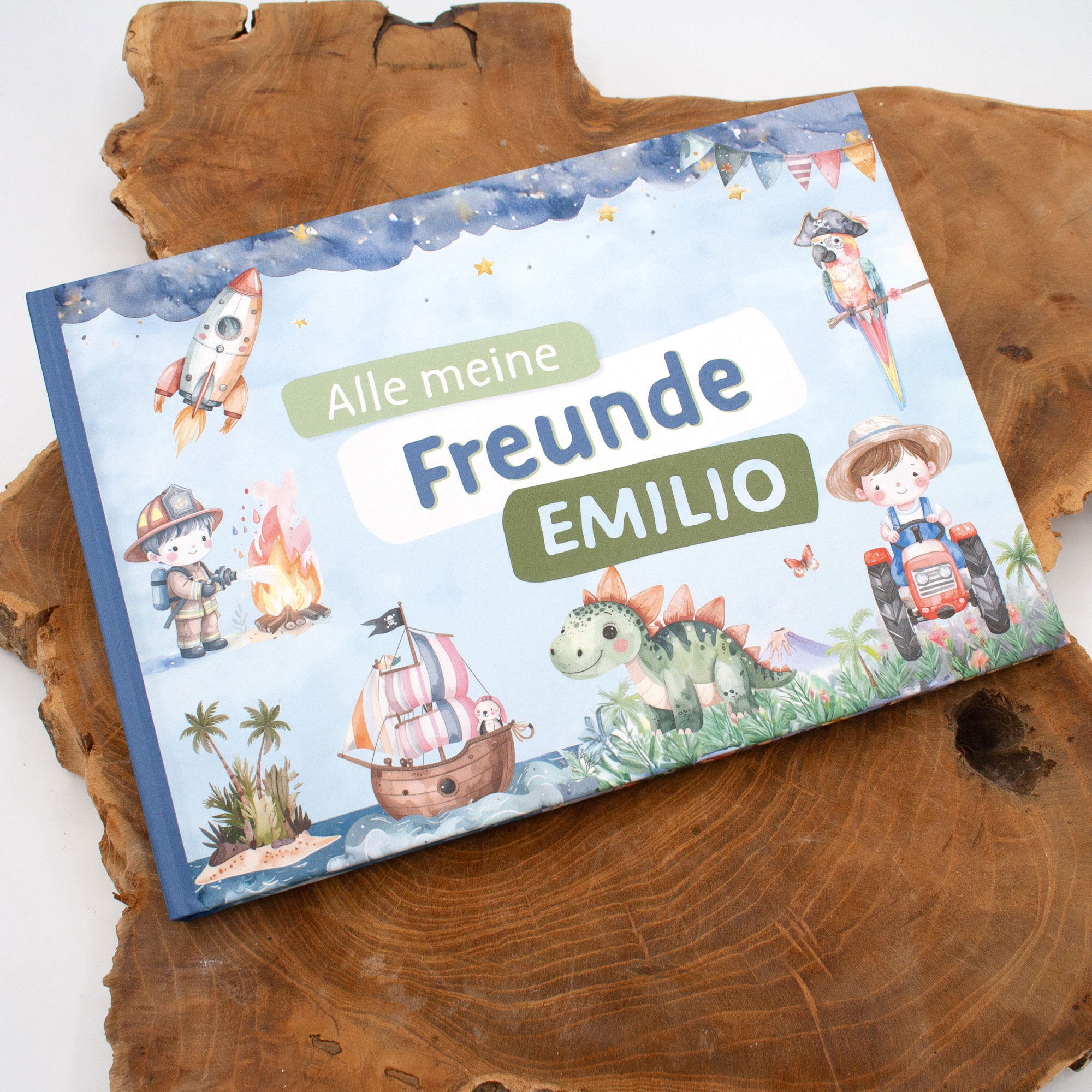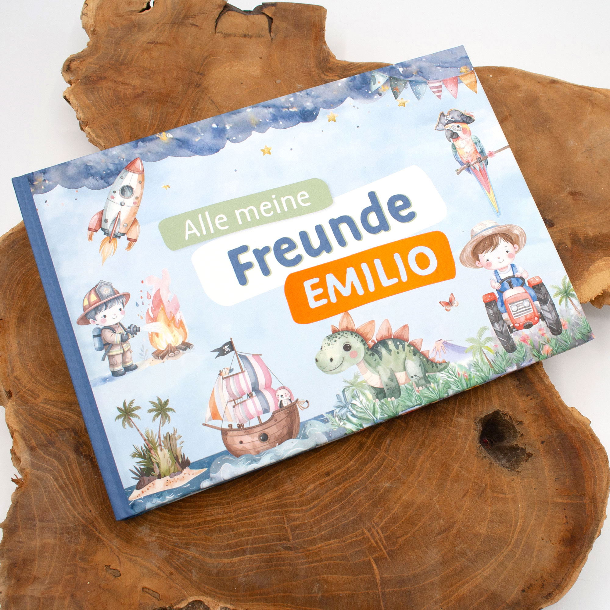 Stell dir vor: Ein stolzer Junge hält sein eigenes Freundebuch in den Händen – mit dem eigenen Namen vorne drauf. Neugierig werden die Seiten durchgeblättert, auf denen Freunde malen, Fragen beantworten und ihre kleinen Geschichten hinterlassen. Jede ausgefüllte Seite wird zu einer wertvollen Erinnerung an eine Zeit voller Spiel, Lachen und gemeinsamer Erlebnisse.