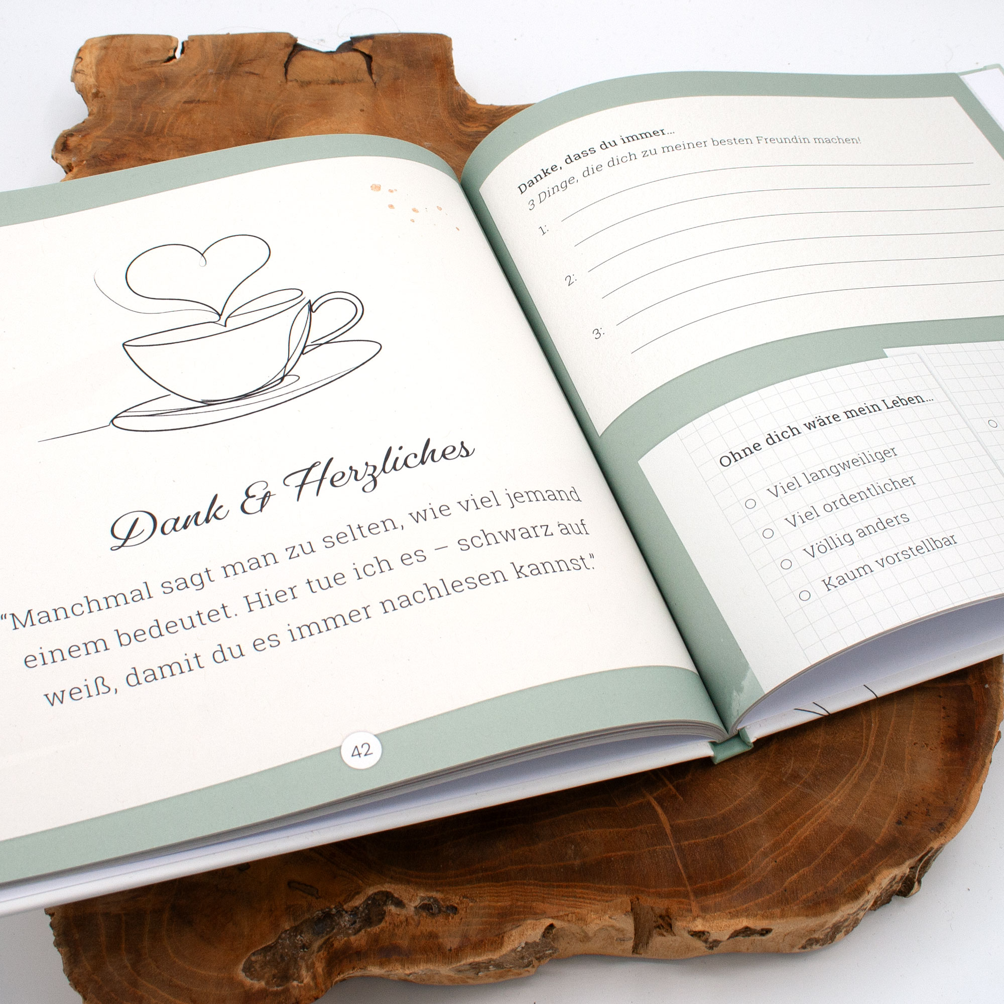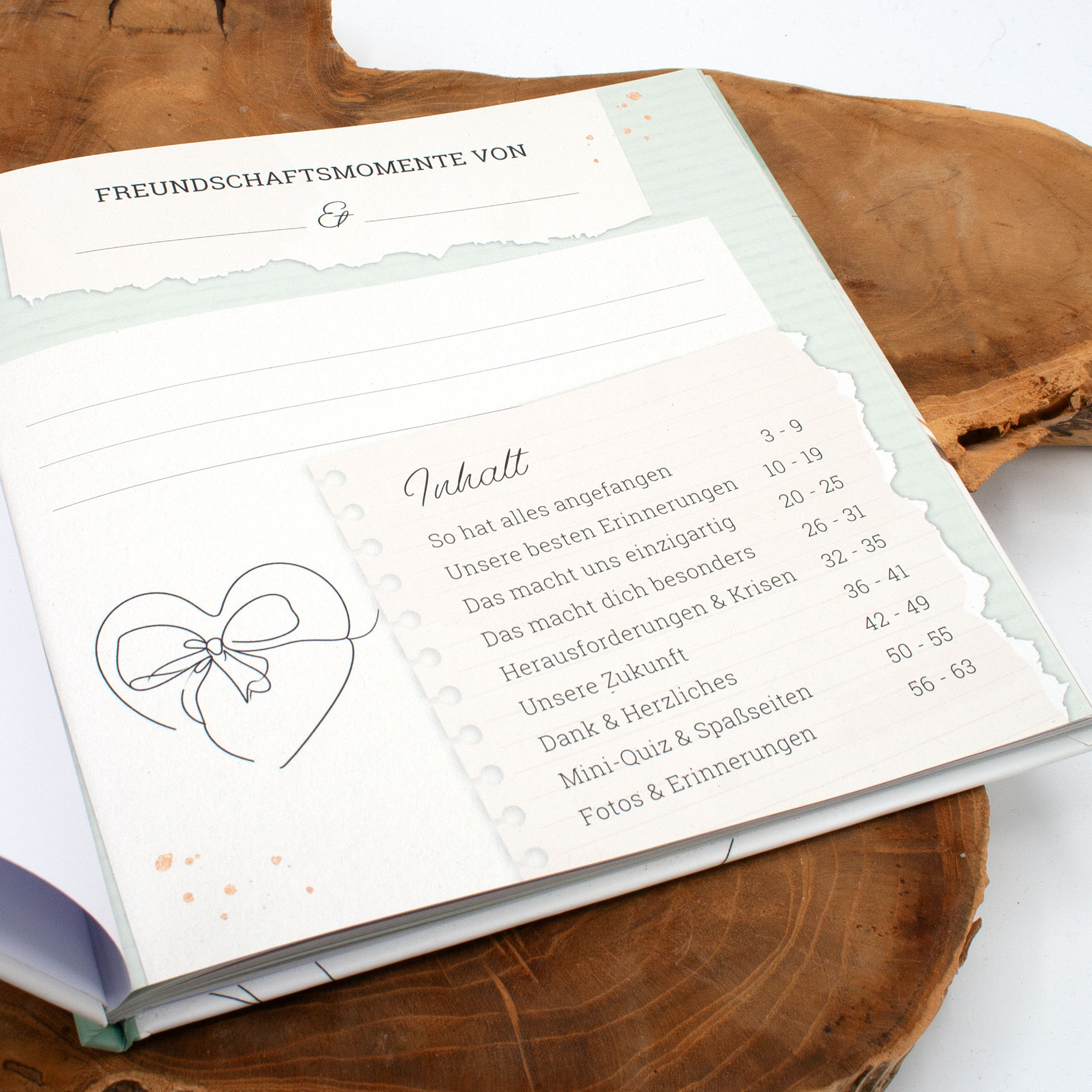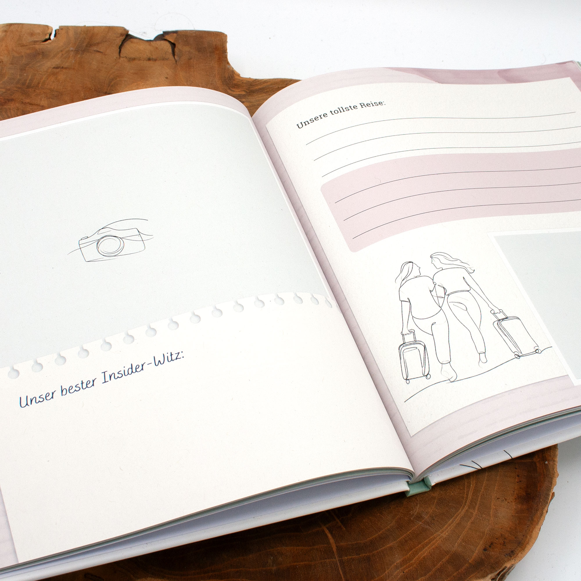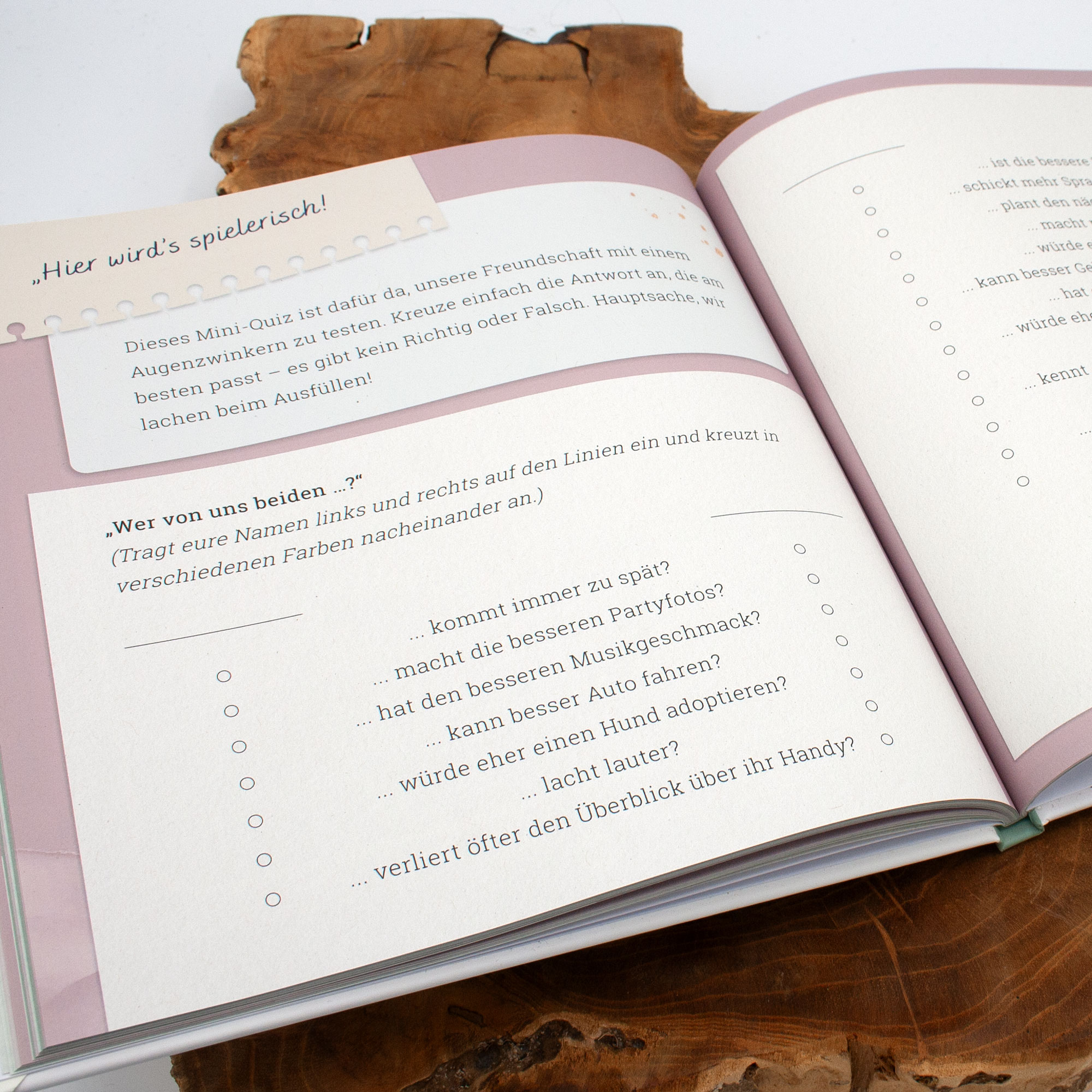 Dieses liebevoll gestaltete Freundinnenbuch ist ein gemeinsames Erlebnis, das euch beide begleitet. Es lädt euch ein, eure Freundschaft auf kreative Weise festzuhalten – mit Fragen, kleinen Quizzes, Platz für Fotos, besonderen Momenten und persönlichen Worten. Das Besondere: Du kannst den Buchtitel personalisieren – mit dem Namen deiner Freundin oder einer eigenen Widmung. So wird jedes Exemplar zum einzigartigen Herzensgeschenk.