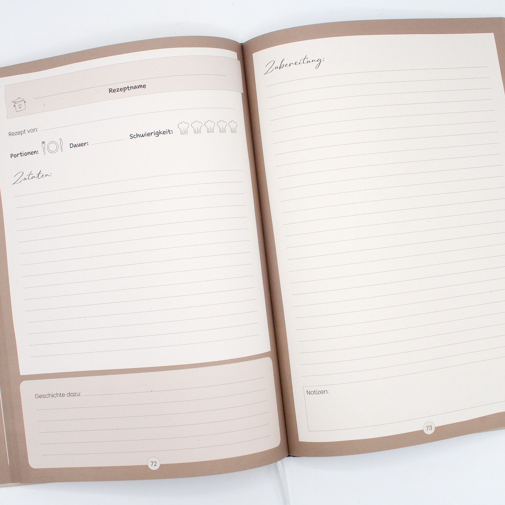* „Unsere liebsten Familienrezepte“ – mit 80 Rezeptseiten, ein- & doppelseitig für kurze oder ausführliche Gerichte