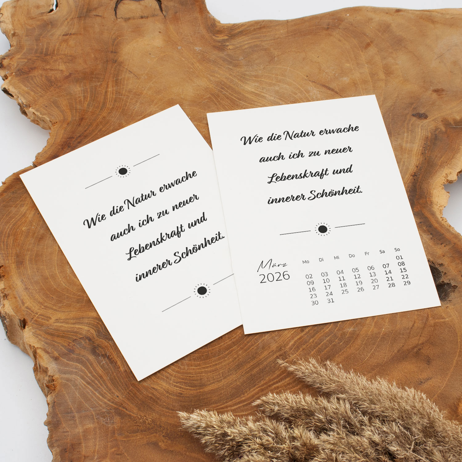 Unser liebevoll gestalteter Monatskalender begleitet dich mit 12 inspirierenden Affirmationen durch das Jahr. Jede DIN A6 Karte bietet auf der Vorderseite ein übersichtliches Kalendarium mit einer kraftvollen Affirmation, die dich stärkt und motiviert. Die Rückseite zeigt die Affirmation als eigenständige Deko-Karte – perfekt für deinen Lieblingsplatz.